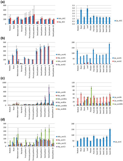 Transcriptional activity of accC genes was associated with leaf tissue and with maturation of seeds or pods (Figure 9d). In L. japonicus, C. cajan and M. truncatula high expression was observed in roots, nodules, or flowers. Summarizing, accC revealed expression patterns similar to those of accA. Moreover, transcription profiles of duplicated accC genes (from G. max, A. ipaensis, and A. duranensis) were generally similar to each other. However, the statistically significant difference was observed between Adu_accC1 and Adu_accC2 transcription level during seed development, which might be associated with their functional differentiation.