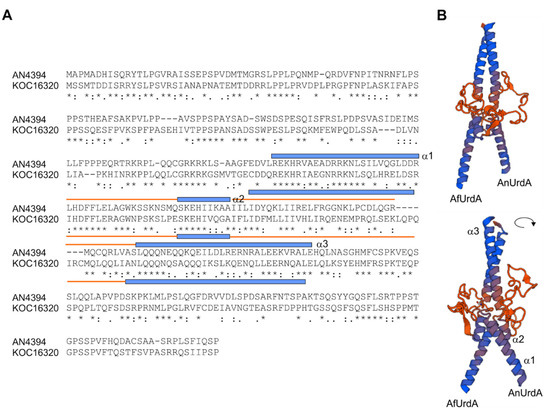3D modeling of UrdA sequence. (A) Sequence alignment of AN4394/AnUrdA and its A. flavus ortholog KOC16320/AfUrdA. The position and extension of the three predicted α-helices of the putative HLH transcriptional regulatory domain are indicated by blue lines while orange lines delimit the extension of the loops. (B) Swiss-model images of a hypothetic dimer formed by the HLH domains of AnUrdA and AfUrdA. Helices are shown in blue and loops in orange.