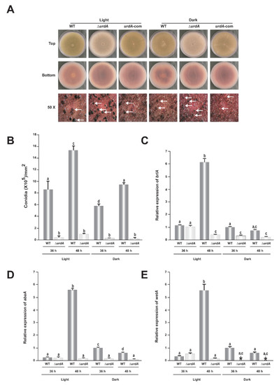 To study the role of UrdA in morphogenesis and other cellular processes in the veA+ wild-type background, a deletion strain (ΔurdA) and a complementation (com) strain were constructed. The deletion strain was confirmed by diagnostic PCR (Figure S3). Re-introduction of the A. nidulans urdA wild-type allele in the ΔurdA strain generated the complementation strain, which was verified by PCR (Figure S4) as described in the Materials and Methods section. The complementation strain presented wild-type phenotype (Figure 3A). In our study, ΔurdA produced notably fewer conidia compared to the wild-type; conidial production at 36 h was ~19-fold and 57-fold reduced in the ∆urdA cultures with respect to those of the wild-type strain growing in continuous light and dark, respectively. These differences continued over time, with a ~14-fold decrease in conidial production in the light and 31-fold in the dark after 48 h (Figure 3B). In addition, a reduction of brlA, abaA and wetA expression was observed in the ∆urdA mutant with respect to the control, particularly in 48 h-old light cultures (Figure 3C–E).