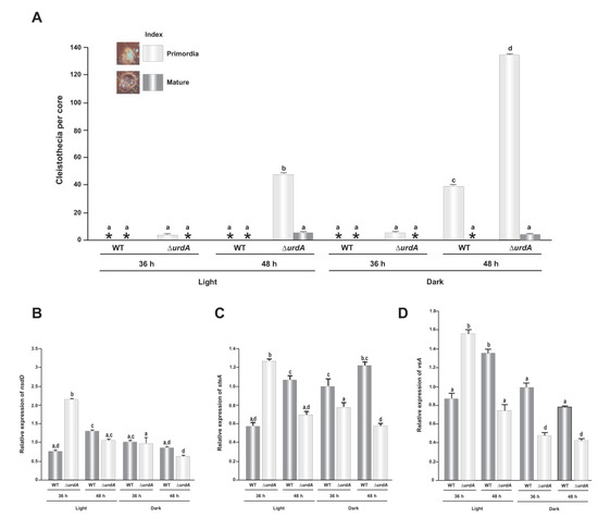The A. nidulans ∆urdA strain presented a precocious and increased sexual development as compared to the wild-type control (Figure 5A). Cleistothecial primordia were already present in ∆urdA cultures after 36 h of incubation, in both light and dark cultures, while they were absent in the wild type. At 48 h, cleistothecia were present in ∆urdA cultures grown in the light and in the dark, some of them already showing pigmentation, while in the wild-type only cleistothecial primordia were observed at that time point, and only in dark cultures. Our gene expression analysis revealed that expression of nsdD, encoding a transcription factor necessary for sexual development [47] increased in the ∆urdA strain at 36 h and under light conditions (Figure 5B). In addition, expression of steA, a gene encoding another transcription factor necessary for cleistothecial formation and ascosporogenesis [48], as well as expression of veA, was more than 2-fold higher in the urdA deletion mutant with respect to the control at 36 h, before the levels decreased over time (Figure 5C). After 7 days ∆urdA cultures showed abundant fully pigmented cleistothecia in both light and dark, whereas the wild type formed few cleistothecia under those conditions (Figure 5A).