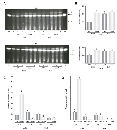 Effect of urdA on sterigmatocystin (ST) production in A. nidulans. (A) Thin-layer chromatography (TLC) analysis of ST produced by wild type (WT) and ΔurdA cultures grown on top-agar inoculated solid GMM at 37 °C in light and dark conditions for 36 h, and 48 h. ST, a commercial ST standard from SIGMA. Broken arrows indicate other metabolites whose synthesis is also affected by urdA. (B) Densitometry of the ST bands using ImageJ software [51]. The ST bands were normalized to wild-type levels in the light, considered as 100 percent. (C) Effect of urdA on aflR and stcU expression analyzed by RT-qPCR. Values are means of three replicates and error bar indicates standard errors. Different letters above the bar graphs represent significantly different values (p ≤ 0.05).