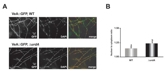 urdA influences accumulation and location of VeA in fungal cells. A. nidulans wild type (WT) and a ΔurdA strain containing a veA::gfp::pyrG cassette were cultured in the dark for 6 h and then shifted to light. (A) Micrographs showing green fluorescence, DAPI stained nuclei, and merged images. (B) Nuclear to cytoplasmic ratio of the fluorescence in each compartments were calculated using the pixel intensity values. The mean were taken from 40 measurements at different nuclear and cytoplasmic compartments. Different letters above the bar graphs represent significantly different values (p ≤ 0.05).