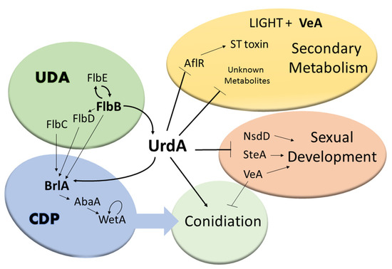 Model for UrdA activity. The upstream developmental activators (UDA) signaling pathway controls UrdA [27], and UrdA controls the central developmental pathway (CDP) pathway and conidiation (in both veA1 [27] and in veA wild-type background, as shown in the present study). UrdA also negatively affects NsdD, SteA and VeA, inhibiting sexual development. In addition, UrdA represses the production of ST (by negatively influencing AflR) and of other known secondary metabolites. Protein codes are used for simplicity.
