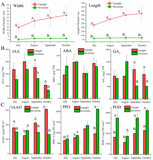 The width and length of the main branch of the upright cuttings were greater than those of the inverted cuttings, and these differences were significant at the 0.01 level (Figure 1A). During the entire observation period, the branch growth of upright cuttings was obviously improved, with maximal increases (6.27 mm for branch width; 71.83 cm for branch length) being observed from July to August, while inverted cuttings showed slow growth, with maximal increases (0.91 mm for branch width; 5.73 cm for branch length) also occurring from July to August.