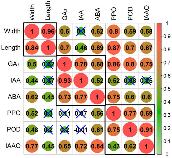 Correlations between growth, hormones, and enzymes. The left diagonal shows the correlations of inverted cuttings, and the right diagonal shows the correlations of upright cuttings. The correlation coefficient without significance is marked with a blue “×” symbol.