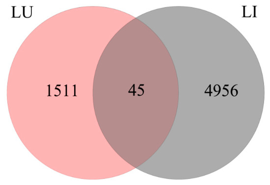 Venn diagram of differentially expressed genes (DEGs) identified through pairwise comparison between group LU and group LI.
