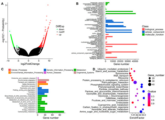Unigenes from all six samples were clustered, and an all-unigene group was generated as a reference transcriptome. The clean reads of the samples were then mapped back to the reference library using Bowtie2 software [63]. In this step, the numbers of reads mapped back to each unigene were counted. We calculated the fragments per kilobase of transcript per million mapped reads (FPKM) to assess expression levels using RSEM software [64] and chose those with an FPKM ≥ 0.5 for downstream analysis. We detected the DEGs between the upright and inverted groups using the NOIseq method [65] and chose those with a fold change ≥2 and probability ≥0.8. TBtools [66] was used for the significant enrichment of DEGs among GO terms and KEGG pathways, and their visualization was carried out in the ggplot2 package of R software [67].