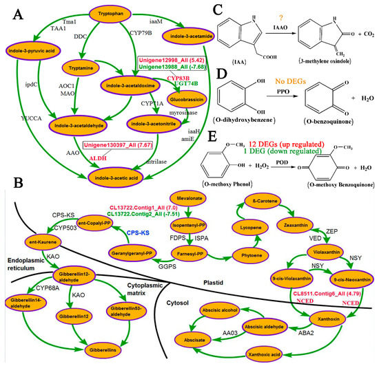 Effects of inversion on the IAA, ABA, and GA pathways and the catalytic reactions of IAAO, PPO, and POD. (A) The biosynthesis of IAA. (B) The biosynthesis of ABA and GA. (C) The reaction catalyzed by IAAO. (D) The reaction catalyzed by PPO. (E) The reaction catalyzed by POD. Red font indicates an upregulated unigene(s) or enzyme(s). Green font indicates a downregulated unigene(s) or enzyme(s). Blue font indicates the enzymes associated with both upregulated and downregulated unigenes. Yellow font indicates the enzymes with no unigenes.