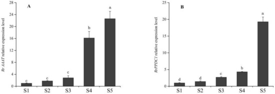 As shown in Figure 4, RrAAAT expression increased continuously during blooming, and peaked during senescence. RrAAAT expression increased slowly from the bud stage to the half-open stage and was 5.7-fold higher during the full-open stage than during the half-open stage. RrAAAT expression continuously increased during the decline stage (Figure 4A). The trend followed by the change in RrPPDC1 expression was similar to that followed by the change in RrAAAT expression; that is, RrPPDC1 expression smoothly increased from the bud stage to the full-open stage. RrPPDC1 expression, however, rapidly increased and peaked, and was 4.47-fold higher during the decline stage than during the full-open stage (Figure 4B).