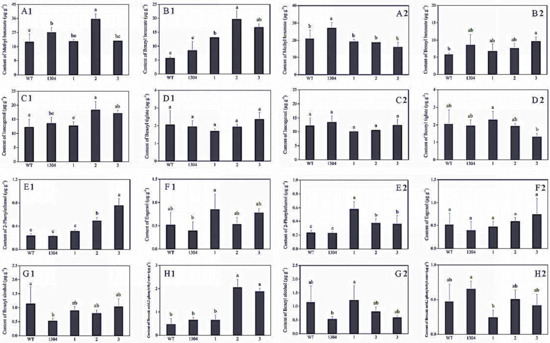 Analysis of the main volatile components in flower of Petunia. (A1–H1) Main volatile components of RrAADC transgenic and control plants; (A2–H2) main volatile components of RrAAAT transgenic and control plants; (A) methyl benzoate; (B) benzyl benzoate; (C) isoeugenol; (D) benzyl tiglate; (E) 2-phenylethanol; (F) eugenol; (G) benzyl alcohol; (H) benzoic acid, 2-phenylethyl ester; (WT) wild type; (1304) pCAMBIA1304 transgenic plants; (1–3) transgenic plants. (±SE, n = 3).