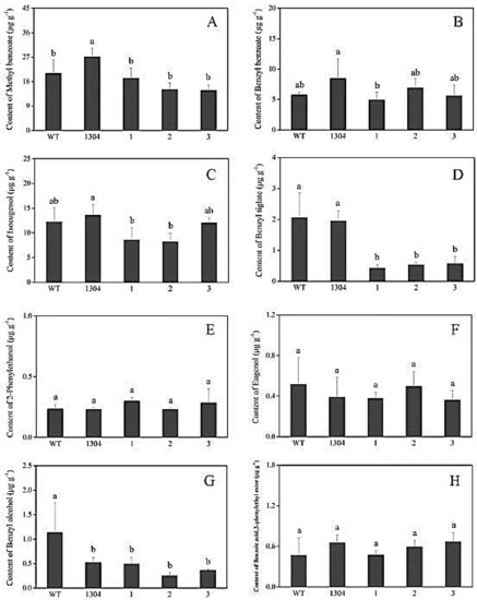 Analysis of the main volatile components in flower of RrPPDC1 transgenic and control Petunia. (A) methyl benzoate; (B) benzyl benzoate; (C) isoeugenol; (D) benzyl tiglate; (E) 2-phenylethanol; (F) eugenol; (G) benzyl alcohol; (H) benzoic acid, 2-phenylethyl ester; (WT) wild type; (1304) pCAMBIA1304 transgenic plants; (1–3) RrPPDC1 transgenic plants (±SE, n = 3).