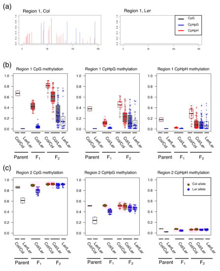 Level of DNA methylations in parents, F1, and F2. (a) Bar plots of DNA methylation level of Col and Ler alleles in region 1; (b,c) The DNA methylation level of each individual for CpG, CpHpG, and CpHpH is plotted as boxplots and dots for region 1 (b) and region 2 (c). In each box, the thick line represents the median. Red and blue dots represent the methylation level of the Col and Ler alleles, respectively.