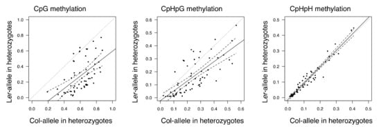 Methylation level correlation between Col and Ler alleles in F2 heterozygotes. Plot of methylation level correlation between Col and Ler alleles in F2 heterogyzotes. Solid lines represent best-fit linear regression lines. Dashed lines represent 95% lower and upper bounds of regression.