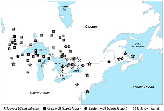 - COSEWIC (Committee on the Status of Endangered Wildlife in Canada). COSEWIC Assessment and Status Report on the Eastern Wolf Canis spp. cf. lycaon in Canada. 2015. Available online: https://www.registrelep-sararegistry.gc.ca/default.asp?lang=En&n=65C48F31-1 (accessed on 14 July 2018).