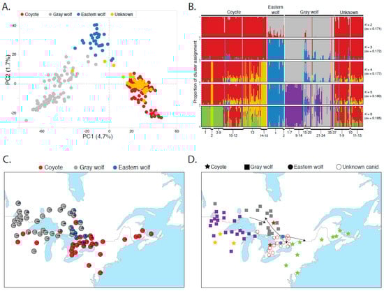 3.1. Eastern Wolves Are a Genetically Isolated Population of Wolves