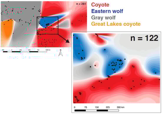 3.4. Eastern Wolves Are Spatially and Genetically Isolated