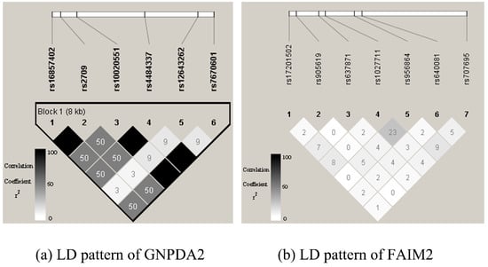 Linkage disequilibrium (LD) patterns of GNPDA2 and FAIM2 used in simulation studies. Figures are LD plots produced using Haploview. GNPDA2 has 6 SNPs, and FAIM2 has 7 SNPs. The number in each square is the LD strength that was measured by , where , 0 means no LD, and 1 means complete LD.