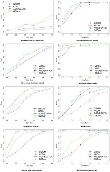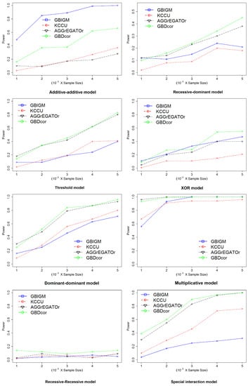 To evaluate the power to detect gene–gene interaction and the ability to control the type-I error rate of GBDcor, we compared GBDcor with three existing techniques: kernel canonical correlation analysis (KCCA) [28,29], the gene-based information gain method (GBIGM) [30], and gene-based gene-gene interaction test (AGGrEGATOr) [31].