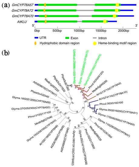 The putative products of the GmCYP78A genes were all structurally similar to that of KLU, in that they had a conservative heme-binding motif in the C-terminal region and a hydrophobic helix structure in their N-terminal region (Figure 1a; Supplementary Figure S2) [35,36,37].