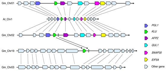 Synteny diagram plot of the soybean and Arabidopsis sequence assemblies surrounding the Arabidopsis KLU gene. The color key for specific genes is as follows: PGL1 (6-phosphogluconolactonase 1, At1G13700)—blue; KLU (cytochrome P450, At1G13710)—green; AFP2 (ABI five binding protein 2, At1G13740)—purple; QUL1 (QUASIMODO2 LIKE 1, At1G13820)—magenta; ANAP30 (Soluble N-ethylmaleimide-sensitive factor adaptor protein 30, At1G13860)—pink; and EIF5A (eukaryotic elongation factor 5A-1, At1G13890)—yellow. The syntenic matching genes in G. max are similarly colored. Solid black lines connect the homologous gene pairs.