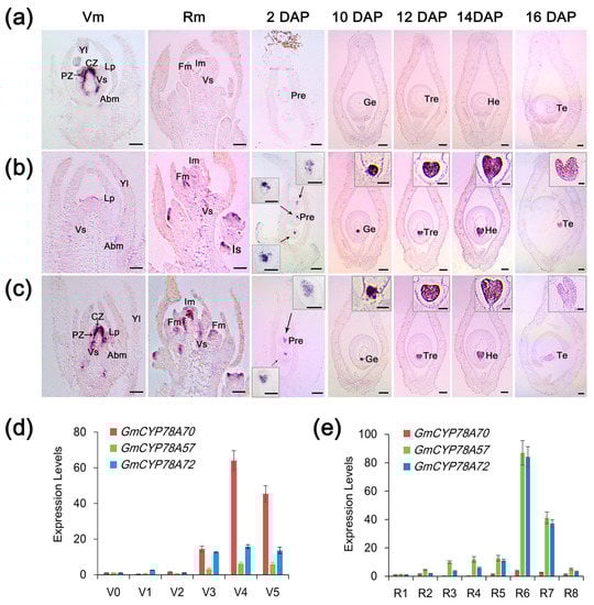 Spatiotemporal expression patterns of GmCYP78As. (a–c) In situ hybridizations of GmCYP78A70, GmCYP78A57 and GmCYP78A72 were performed respectively in the vegetative meristem (Vm), reproductive meristem (Rm), and the carpel and young pod. Scale bars = 100 μm. For the boxed insets of (b,c) the scale bars = 20 μm. (d) Expression levels of GmCYP78As at each stage of the vegetative phase (V0–V5). (e) Expression levels of the GmCYP78As at each stage of the reproductive phase (R1–R8). Expression levels at the V0/R1 stage were set to 1, while those at other stages were adjusted accordingly. Data shown are mean ± SE (n = 3, biological replicates). CZ, central zone; PZ, peripheral zone; Abm, axillary bud meristem; Vs, developing vascular strand; Fm, floral meristem; Im, inflorescence meristem; Is, inflorescence stem; Pre, proembryo; Ge, global embryo; Tre, transition embryo; He, heart embryo; Te, torpedo embryo; DAP: days after pollination.