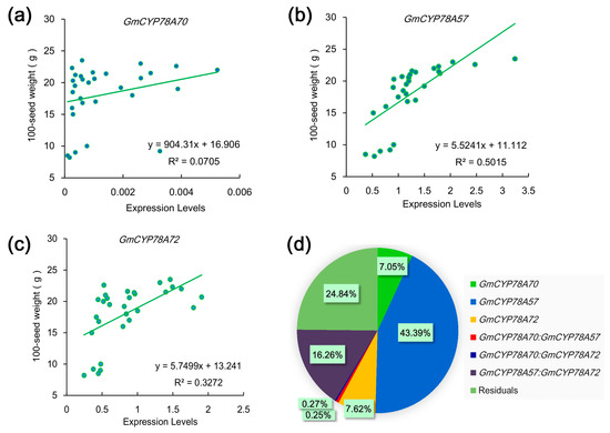 Larger seeds offer the newly germinating seedling a larger initial supply of nutrients which increases their competitiveness during seedling establishment and strengthens their tolerance to adverse environmental conditions [53]. Since GmCYP78A72 is involved in regulating seed size, we speculated that those soybean cultivars with larger seeds might exhibit higher expression of GmCYP78A72. To test this hypothesis, we analyzed the correlation between the expression levels of GmCYP78As and the 100-seed weight. We used 30 soybean cultivars on the basis of different 100-seed weights to test the expression levels of the three genes in seeds that were in the late maturation stage [54]. The 100-seed weight and the expression levels of GmCYP78A57 and GmCYP78A72 were positively correlated, with Person’s r coefficients of 0.71 (R2 = 0.5015) and 0.57 (R2 = 0.3272) (Figure 6b,c), respectively, whereas that of GmCYP78A70 was weak, at 0.27 (R2 = 0.0705), which meant the GmCYP78A70 expression level and the 100-seed weight were not related (Figure 6a). To further determine the contribution of GmCYP78As towards seed size improvement, we fitted regression models between the 100-seed weight and the expression levels. The percentage contributions of GmCYP78A57, GmCYP78A70 and GmCYP78A72 were 43.39%, 7.05% and 7.62%, respectively (Figure 6d). Hence, GmCYP78A57 significantly regulated the growth of seeds and its contribution was higher than that of GmCYP78A70 and GmCYP78A72 combined.