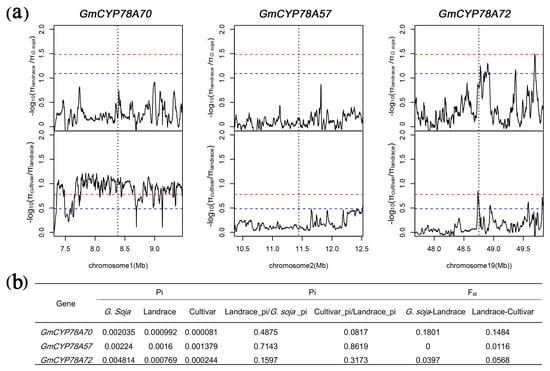 Selective pressure analysis for GmCYP78As. (a) π ratios of the GmCYP78As regions between different soybean populations. The red and blue dotted lines respectively represent the top 1% and top 5% thresholds selected to determine the region under evolutionary selection. The gray vertical lines correspond to the location of each GmCYP78A. (b) Index values relate to selective sweep in coding regions of GmCYP78As.