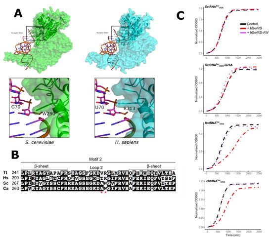The aminoacylation domain of the class II aaRS enzymes contains antiparallel β sheets. The loop between strands 2 and 3 comprise the conserved motif 2, which interacts with the tRNA acceptor arm [34]. The crystal structures of SerRS from several organisms have been solved. Included in these are the human enzyme and a structure of the T. thermophilus enzyme in complex with tRNASer. Unfortunately, in the latter, the acceptor stem is not fully resolved. Models for the interaction of SerRS with tRNASer position motif 2 close to base pairs 3:70 and 4:69 of the acceptor stem (for example see Figure 5A and Reference [25]). To begin to identify what may account for the different acceptor stem preferences of the SerRS enzymes, we performed a sequence alignment of motif 2 from the human, T. thermophilus, C. albicans, and S. cerevisiae enzymes. The human and T. thermophilus enzymes prefer a A3:U70 base pair in the acceptor stem, whereas the two yeast enzymes prefer C3:G70. Two residues in motif 2 are conserved in the yeast enzymes that differ in the human and T. thermophilus enzymes (Figure 5B). Trp290 and Ala297 of the S. cerevisiae enzyme align with Arg and Gln, respectively, in T. thermophilus and human enzymes. Ala297 is not well conserved across yeast and fungal species containing C3:G70 tRNASer (Figure S5); in contrast, the 290 position is conserved in yeast and is proximal to the base at position 70 (Figure 5A). We constructed a version of hSerRS, where residues T312 and R313 in motif 2 were converted to the corresponding yeast residues A and W. The mutated hSerRS was introduced into BY4742 containing wild-type SctRNASerUGA, SctRNASerUGG-G26A, HstRNASerUGG, or chtRNASerUGG (Figure 5C). The wild-type human SerRS decreased the growth rate in strains containing the human or chimeric tRNASer but did not affect the strains containing the yeast tRNAs. In contrast, the hSerRS TR to AW mutant did not alter the growth rate in these strains when compared to the yeast SerRS, suggesting that T312 and R313 are important for the function of the human SerRS on the human tRNA.
