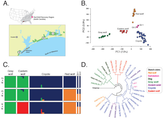 3.1. Galveston Island Canids Carry Red Wolf Genetic Signatures