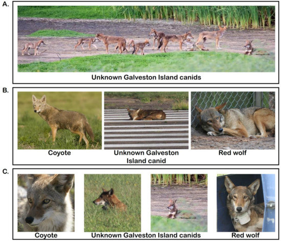 Photographic comparison of coyotes, Galveston Island (GI) canids, and red wolves. Photo credit and location as follows: (A) Pack of GI canids, Galveston Island, TX, credit: R. Wooten. (B) Western coyote, Intermountain West, United States, credit: Wikimedia commons, Rich Keen/DPRA. GI canid laying on airport runway, Galveston Island, TX, credit: R. Wooten. Captive female red wolf, Alligator River National Wildlife Refuge, NC, credit: R. Nordsven, USFWS. (C) Western coyote, Joshua Tree National Park, CA, credit: Wikimedia commons, Michael Vamstad/NPS. Headshots of GI canids, Galveston Island, TX, credit: R. Wooten. Wild juvenile male red wolf prior to release, Albemarle Peninsula, NC, credit R. Nordsven, USFWS.
