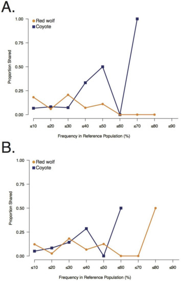 Sharing of red wolf and coyote private alleles with the two Galveston Island, Texas canids, (A) GI-1 and (B) GI-2, and their frequencies in their respective reference populations.
