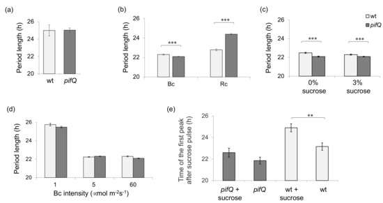 Our first goal was to determine whether and how blue light affected photosynthate regulation of the circadian oscillator. We grew pifQ and wt plants in Bc in the presence of 2% sucrose and examined the circadian rhythms of leaf movements. Figure 1a shows that, unlike under a wide range of fluences of constant red light (Rc) or in the dark (DD) [16], in Bc, the pifQ mutant did not show a long circadian period phenotype in the presence of sucrose. Expanding on this initial finding by analyzing LUC activity in pifQ CCA1:LUC and wt CCA1:LUC lines, we observed that, while pifQ CCA1:LUC plants grown on 3% sucrose in Rc had longer periods (pifQ 24.4 ± 0.07; wt 22.8 ± 0.1), plants growing in Bc had slightly but consistently shorter periods than wt CCA1:LUC (pifQ 22.1 ± 0.03; wt 22.3 ± 0.05; Figure 1b,c). Moreover, although increasing intensities of Bc caused a shorter period phenotype in both pifQ CCA1:LUC and wt CCA1:LUC lines in the presence of sucrose, there were only small differences between the responses of pifQ CCA1:LUC and wt CCA1:LUC (Figure 1d).