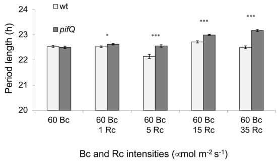 Low levels of red light are sufficient to restore the long period pifQ phenotype. pifQ CCA1:LUC and wt CCA1:LUC lines were entrained for 8 days in 14 h: 10 h, light: dark (white light, 100 µmol m−2 s−1) on medium, supplemented with 3% sucrose before being transferred to different constant light conditions (60 µmol m−2 s−1 Bc, 60 µmol m−2 s−1 Bc + 1 µmol m−2 s−1 Rc, 60 µmol m−2 s−1 Bc + 5 µmol m−2 s−1 Rc, 60 µmol m−2 s−1 Bc + 15 µmol m−2 s−1 Rc, 60 µmol m−2 s−1 Bc + 35 µmol m−2 s−1 Rc), and luciferase activity measured. Average of 2–4 biological repeats. n ≥ 103. * p < 0.05, *** p < 0.001 (Student two-tailed t-test).