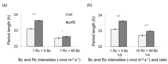 The different effects of red and blue light on PIF-mediated sucrose regulation of the circadian oscillator (Figure 1) in [16] prompted us to examine how simultaneous irradiation with red and blue light affected sucrose signaling. Our results suggest that that even very low levels of red light (1 µmol m−2 s−1) partially reversed the blue light effects on the pifQ phenotype; with higher red-light intensities (more than 5 µmol m−2 s−1), pifQ CCA1:LUC plants showed a significantly longer period than wt CCA1:LUC (Figure 2). Moreover, under identical Rc conditions, the effect of pifQ on the period was affected by Bc levels; in 1 µmol m−2 s−1 red + 5 µmol m−2 s−1 blue (Rc/Bc is 1/5), pifQ CCA1:LUC plants had 0.52 h longer circadian periods than wt CCA1:LUC, but at Rc/Bc 1/60 (1 µmol m−2 s−1 red + 60 µmol m−2 s−1 blue), the difference in circadian period between wt CCA1:LUC and pifQ CCA1:LUC plants was much smaller (0.1 h, Figure 3a). To determine whether the pifQ phenotype was dependent on total light fluence or the Rc/Bc ratio, we examined plants under similar Rc/Bc ratios but with different intensities. Figure 3b shows that pifQ CCA1:LUC plants showed longer period phenotypes under both high and low total flux densities, suggesting that the ratio of Rc/Bc—rather than the total levels of Rc—may affect PIF-dependent entrainment of the oscillator in response to sucrose. This is consistent with the significant difference in period between wt CCA1:LUC and pifQ CCA1:LUC at similar (61 and 65 µmol m−2 s−1) fluences but different (Rc/Bc 1/60 and 1/12) Rc/Bc ratios (Figure 2). Together our results suggest that PIF mediation of photosynthate signaling to the circadian oscillator is light-quality-dependent.