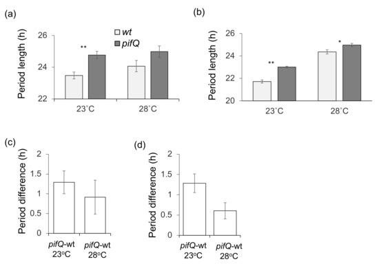PHYTOCHROME INTERACTING FACTOR 4 is known to participate in temperature sensing by plants [27], and the circadian oscillator has been shown to gate (i.e., restrict to certain times of day) PIF4-mediated thermo-responses [28]. We examined whether temperature affected the PIF-mediated sucrose entrainment of the circadian oscillator. Figure 4 shows that pifQ plants have a more reduced period phenotype of both leaf movements and CCA1:LUC at 28 °C than at 23 °C. pifQ mutants show a 1.3 h longer period of leaf movements than wt plants at 23 °C, compared with a 0.9 h longer period at 28 °C (Figure 4a,c). The difference in CCA1:LUC period between pifQ and wt plants is 1.3 h at 23 °C and 0.6 h at 28 °C (Figure 4b,d). Our results suggest that PIFs have more of a role in the sucrose entrainment of the oscillator at lower temperatures.