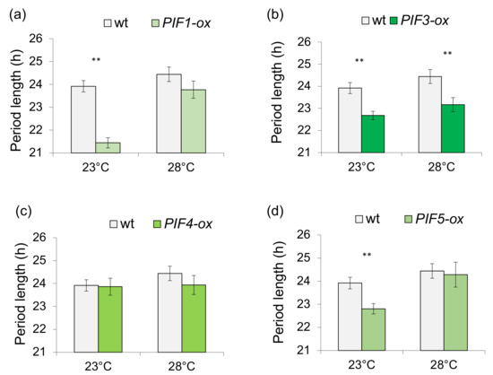 Circadian period of leaf movements of wt and PIF-overexpressing plants. Plants growing on 2% sucrose containing medium were entrained for 8 days at 14 h: 10 h, light: dark (100 µmolm−2s−1) at 23 °C before being transferred to constant white light (provided by fluorescent lamps; 50 μmol m−2 s−1; colour temperature 6500 K) at 23 °C or 28 °C. (a) PIF1-ox, (b) PIF3-ox, (c) PIF4-ox, (d) PIF5-ox. Average of 2–3 biological repeats, n = 17–41. ** p < 0.01 (Student two-tailed t-test).