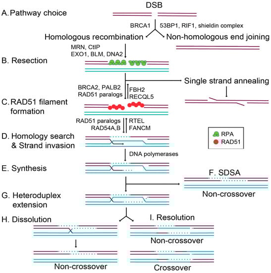 Once DNA end resection occurs, the HR pathway can be utilized. Increasing evidence suggests that the primary role of HR is actually to repair DNA damage that occurs during replication []. While canonical HR repairs a direct DSB, this pathway can also repair lesions produced by stalled or collapsed replication forks []. Cells commit to a homology-directed mechanism of repair when extensive resection is performed by the action of multiple nucleases. Short and long-term resection is mediated by MRN/CtIP in conjunction with EXO1 or BLM and DNA2 (Figure 1B) []. This resection reveals 3′ ssDNA ends, which are quickly coated by the replication protein A (RPA) complex [,]. Filaments coated by RPA ensure that the ssDNA overhangs are not degraded, and prevent secondary structures from forming []. RAD51 then displaces RPA to form the pre-synaptic filament, and this requires the activity of several so-called RAD51 mediator proteins (Figure 1C) []. RAD51 nucleoprotein filaments search for a homologous sequence to invade and displace one strand of the homologous template to form a displacement loop (D-loop; Figure 1D) []. In canonical HR, this structure allows for the pairing of the broken strand with the displaced strand to form a heteroduplex (Figure 1D), and DNA synthesis restores any missing nucleotides at the break site (Figure 1E). Subsequently, second end capture results in the formation of a double Holliday junction (dHJ) (Figure 1G). This intermediate is resolved through either a dissolution or resolution mechanism, yielding noncrossover (NCO) [] or crossover (CO) (Figure 1H,I) []. Alternatively, during synthesis-dependent strand annealing (SDSA), only one-end invasion occurs, thus forming a single Holliday junction, and this intermediate is dissolved into an NCO product (Figure 1F) []. In this review, we will focus on the mechanisms that regulate the commitment to HR through the RAD51 mediators.