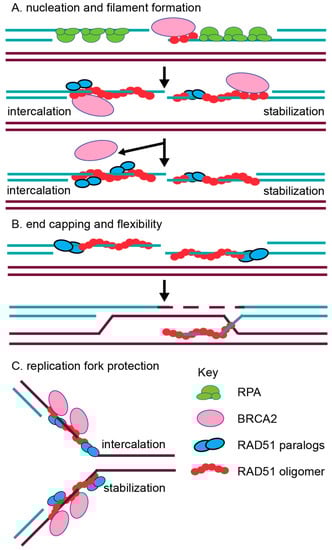 Proposed functions for the RAD51 paralogs. (A) Nucleation and filament formation. Traditionally, the RAD51 paralogs (blue circles) are thought to aid RAD51 (red circle) in filament formation with BRCA2 (pink circle), which nucleates RAD51 monomers onto ssDNA (turquoise lines). The RAD51 paralogs may act by intercalating into the RAD51 filament directly (shown on left) or by binding to the RAD51 filament to stabilize RAD51 (shown on right). Subsequently, BRCA2 is removed as the filament is stabilized and elongated. (B) RAD51 paralog function in RAD51 filament end capping and flexibility were recently proposed [,]. These functions would aid in RAD51 downstream activity to promote strand invasion. (C) Replication fork protection function has also been proposed for the RAD51 paralogs []. During fork protection, the RAD51 paralogs could potentially intercalate into (top strand) or stabilize (bottom strand) the RAD51 filament at a stalled replication fork.