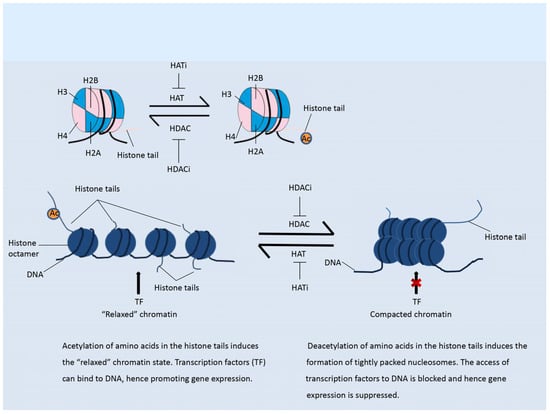 Histone acetylation. Left panel: Acetylation of histones maintains the “relaxed” status of chromatin. Transcription factors (TF) can easily bind to the DNA, hence promoting gene expression Right panel: Deacetylation of histones induces the formation of tightly packed nucleosomes, which suppress the binding of transcription factors to DNA and hence inhibits gene expression.