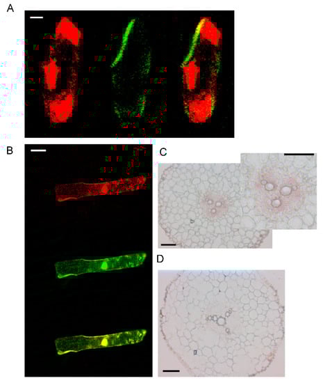 Subcellular and tissue localization of AhYSL3.1. (A) 35S-DsRed, as a marker of the cytosol and nucleus, was cointroduced into onion epidermal cells with the AhYSL3.1 ORF fused with GFP. Red signals (left panel) are from 35S-DsRed. Green signals (middle panel) are from AhYSL3.1-GFP. Right panel shows a merged image. Scale bars represent 20 μm. (B) GFP alone was colocalized with 35S-DsRed. Scale bars represent 100 μm. (C,D) In situ hybridization analysis of AhYSL3.1 in peanut roots. AhYSL3.1 antisense (C) and sense (D) probes were hybridized in a cross section of peanut roots. Bars = 100 μm.