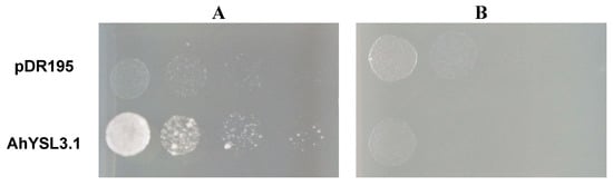 In S. cerevisiae, the CTR-type proteins were identified for copper transport. CTR1 and CTR3 are localized to the plasma membrane and are required for Cu uptake [48,50]. Whereas, CTR2 mediates copper mobilization from vacuoles [51]. In this study, a yeast mutant, which is defective in high-affinity Cu uptake of CTR1, was used for a yeast functional complementation assay. The yeast mutant expressing AhYSL3.1 grew well in the culture medium containing Cu–NA but not well in the Cu2+ condition, as shown in Figure 4, suggesting that in the yeast mutant AhYSL3.1 uptake Cu–NA. This result indicates that AhYSL3.1 is a Cu–NA transporter. Different from AhYSL3.1, in Arabidopsis COPTs restored the growth of a mutant yeast strain in the Cu2+ condition, indicating COPTs transport Cu2+ [8].