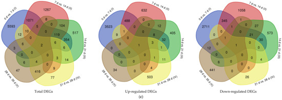 The number of differentially expressed genes (DEGs) in five stages of cold-stored loquat fruits. (a) Volcano plots illustrated the expression patterns of DEGs in different stages; red spots were up-regulated DEGs and green spots were down-regulated DEGs; (b) Barchart showed the number of DEGs detected in different stages; (c) Venn programs exhibited the overlapped DEGs among different stages.