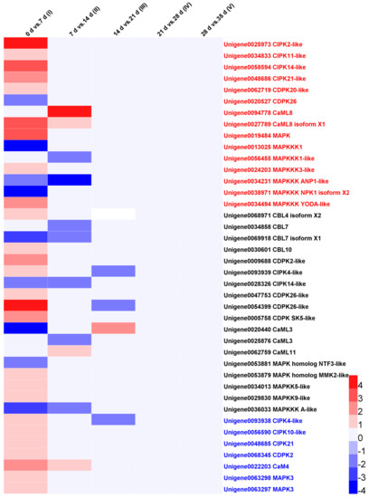 Based on the annotation, the DEGs of protein kinases and protein phosphatases were identified and counted. Moreover, the DEGs of Ca2+ signal components were selected and exhibited by heatmaps using HemI [38], including calmodulin (CaM), calmodulin-like (CaML), calcineurin B-like protein (CBL), calcium-dependent protein kinase (CDPK), CBL-interacting protein kinase (CIPK), calcium/calmodulin-dependent protein kinase (CaMK), calcium/calmodulin-regulated receptor-like kinase (CRLK), and mitogen-activated protein kinase (MAPK) cascade members. All DEGs were differentially expressed in at least any one of the five stages.