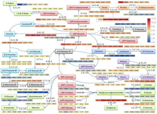The predicted pathway of major sugars and polysaccharides metabolisms in cold-stored loquat fruits. Red boxes: NDP-sugars; sky blue boxes: sucrose metabolism; purple boxes: starch metabolism; blue boxes: cellulose metabolism; orange boxes: pectin metabolism; green boxes: hemicelluloses metabolisms; gray boxes: other metabolites; dashed box: pectin methylesterase inhibitor. Solid arrow represents the reaction is direct while dashed arrow means there are several reactions between these two metabolites. The numbers next to arrows (i.e., 3.2.1.26) are enzyme codes (Table 3). Dispersive heatmaps with different colors next to enzyme codes exhibited the log2 reads per kilobase per million reads (RPKM) value of the enzymes and the numbers in different boxes exhibit the corresponding RPKM values. The heatmap boxes from left to right were zero days, seven days, 14 days, 21 days, 28 days, and 35 days, respectively.