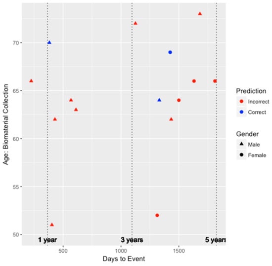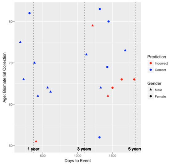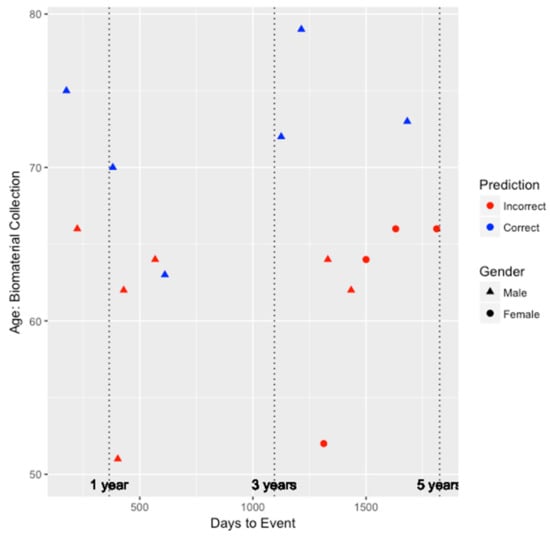 To better understand the ability of the integrated genetic-epigenetic tool to identify those who were at high risk of symptomatic CHD within five years, we visualized the predictions in the test set with respect to age, gender, and days to symptomatic CHD event, as shown in Figure 1. The average time to event among the 20 individuals in the test set who developed symptomatic CHD within five years is 1016 ± 541 days or 2.78 ± 1.48 years. As seen in Figure 1, the accuracy of the predictions does not appear to be biased by age or gender. Additionally, the tool appears to perform very well (seven out of eight individuals) at identifying those who are at high risk within three years of biomaterial collection.