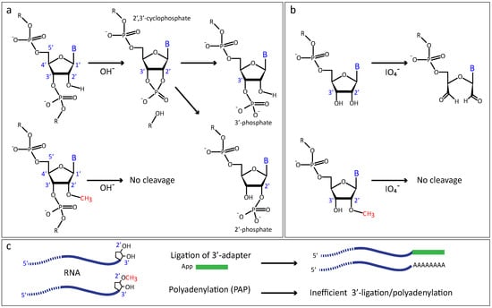 First of all, the presence of a methyl (-CH3) group at the 2′-OH of the ribose preferentially stabilizes 3′-endo ribose conformation, typical for nucleotides in A-type RNA chain [2,3,4,5,6]. Secondly, methylation of the ribose 2′-OH almost completely abolishes the nucleophilic property of the 2′-OH oxygen atom, leading to a greatly increased resistance of the 3′-adjacent phosphodiester bond to alkaline hydrolysis (Figure 1a), as well as to nuclease cleavage (RNase T2 and RNase H, for example). Thirdly, when a 2′-O-Me is present at the 3′-terminal nucleotide, the methyl group prevents the coordination with bidentate oxidative agents, such as periodate (IO4−) ion, and thus protects the terminal ribose [7] (Figure 1b). Such 3′-terminal 2′-O-methylation also negatively affects the ligation efficiency by RNA ligase [8,9] and the 3′-end activity of polyA-polymerase [10,11] (Figure 1c).