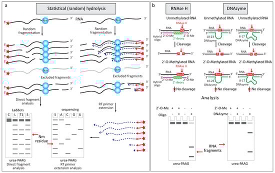 Resistance of 2′-O-methylated RNA to alkaline cleavage was later exploited in site-specific detection approach based on the use of RNase H [40,41] and two DNA-based ribozyme (DNAzyme) versions for specific RNA cleavage [42] (Figure 2b).