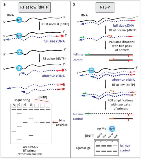 Quantification of low [dNTP] RT stops by quantitative reverse transcription coupled with PCR amplification (qRT-PCR), the so-called RTL-P approach [49], Figure 3b) was proposed for relative quantification of 2′-O-methylation site by site. More recently, an engineered KlenTaq RT-enzyme, specific to 2′-O-methylation, was developed. It can now replace low [dNTP] conditions, since the mutant enzyme is sensitive to 2′-O-methylations and is stalling at those residues even at normal dNTP concentrations [50].