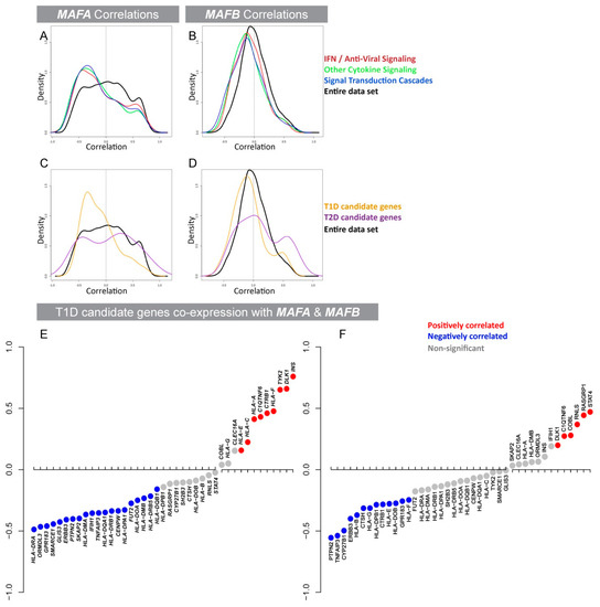 MAFA and MAFB co-expression comparisons in human islets show a strong correlation between MAFA and cytokine-induced signaling and T1D risk genes. (A,B) Density correlation distribution plot for interferon, cytokine, and cytokine-induced signaling genes with MAFA (p-values are p = 3.777 × 10−10, p < 2.2 × 10−16, and p < 2.2 × 10−16, respectively) and MAFB (p = 5.457 × 10−9, p < 2.2 × 10−16, and p < 2.2 × 10−16, respectively) expression. (C,D) T1D candidate gene (yellow curve) correlations have significantly higher negative associations with MAFA (p = 7.942 × 10−5) than with MAFB (p = 0.01756) expression. (C,D) T2D candidate gene (purple curve) correlations with MAFB (p = 0.008516) and MAFA (p = 0.4022). (A–D) Black curve represents the density correlations from the whole transcriptome with MAFA and MAFB (n = 21,806). (E–F) HLA and islet expressed T1D susceptibility gene expression correlations with (E) MAFA and (F) MAFB. p < 0.01 was considered significant and was determined using Kolmogorov–Smirnov tests.
