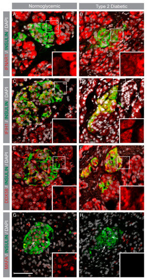 - Butler, A.E.; Robertson, R.P.; Hernandez, R.; Matveyenko, A.V.; Gurlo, T.; Butler, P.C. Beta cell nuclear musculoaponeurotic fibrosarcoma oncogene family A (MafA) is deficient in type 2 diabetes. Diabetologia 2012, 55, 2985–2988. [Google Scholar] [CrossRef] [PubMed]